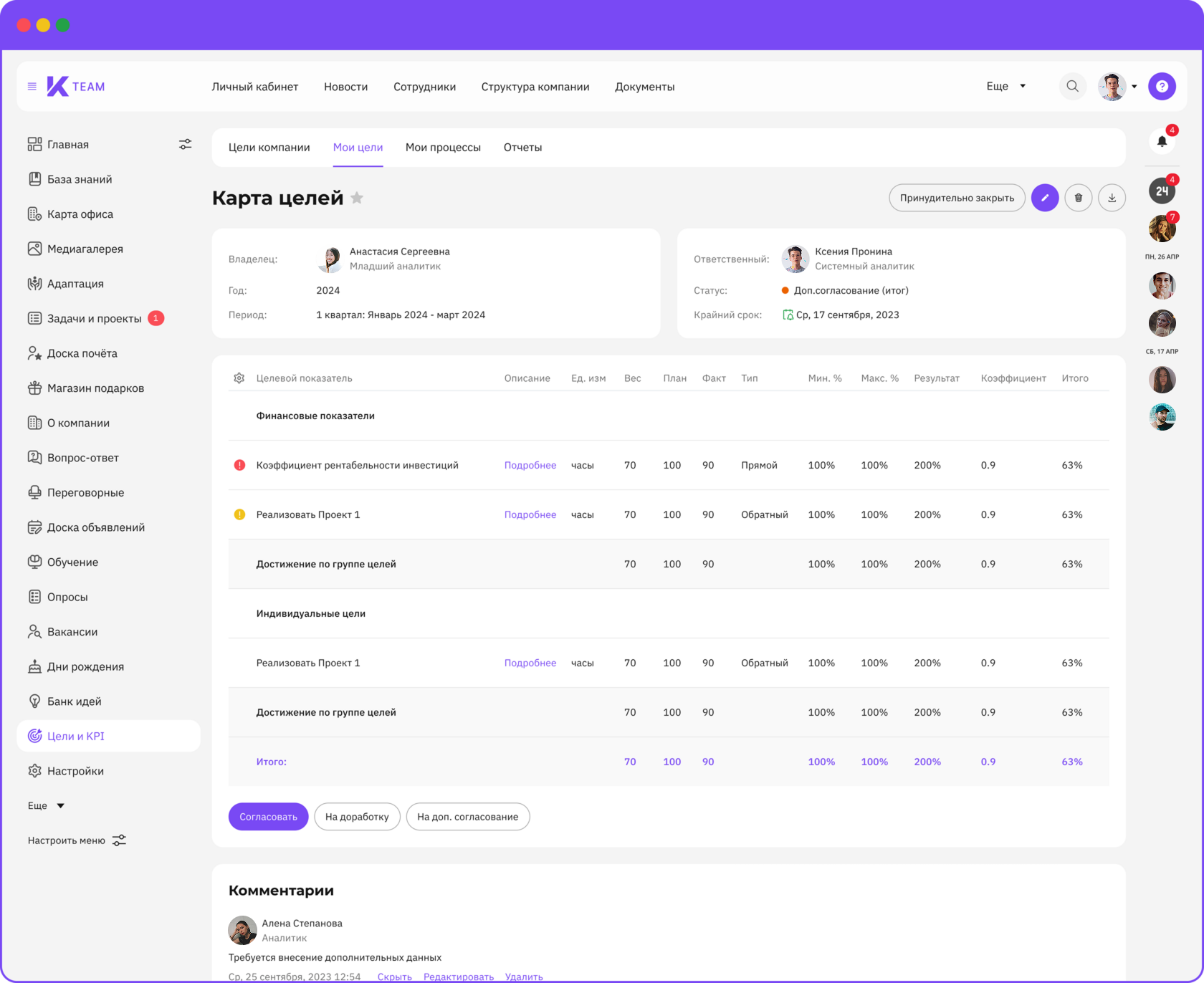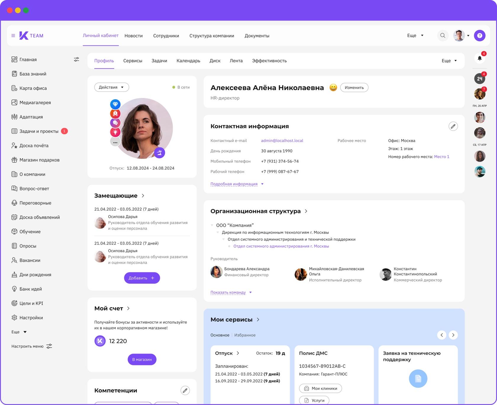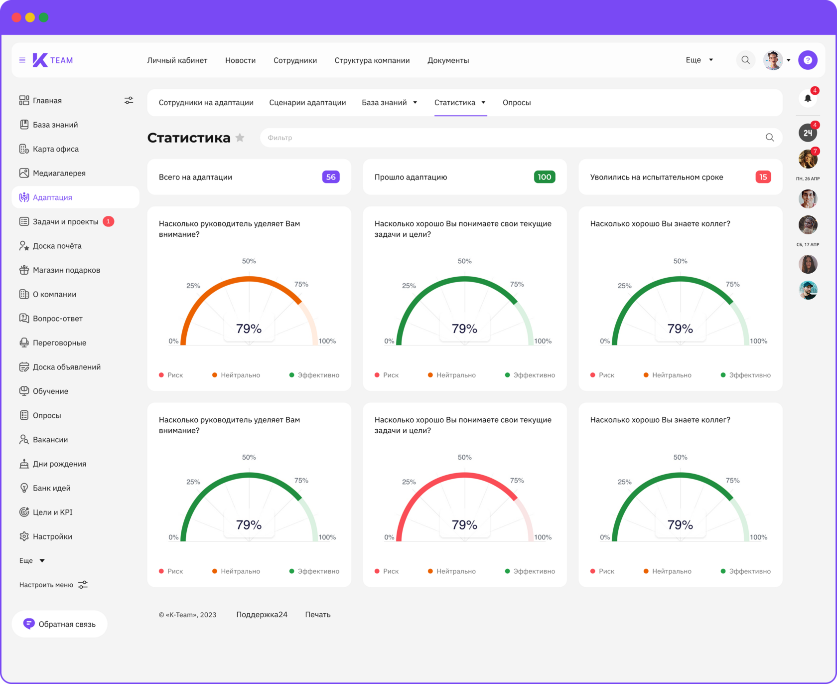 K-Team HRM — это модульное all-in-one решение, разработанное ГК «КОРУС Консалтинг». В состав платформы входят корпоративный портал, личный кабинет сотрудника, база знаний, модули адаптации, геймификации, обучения и развития, управления по целям и KPI и не только.