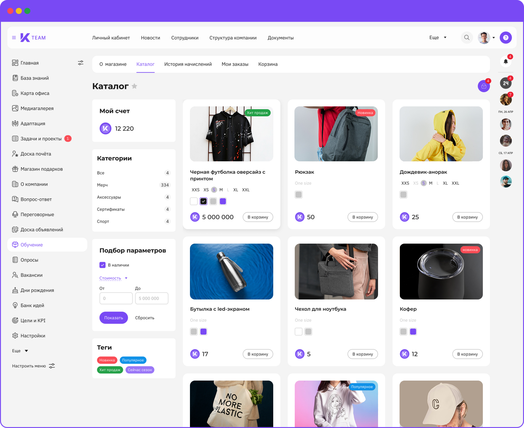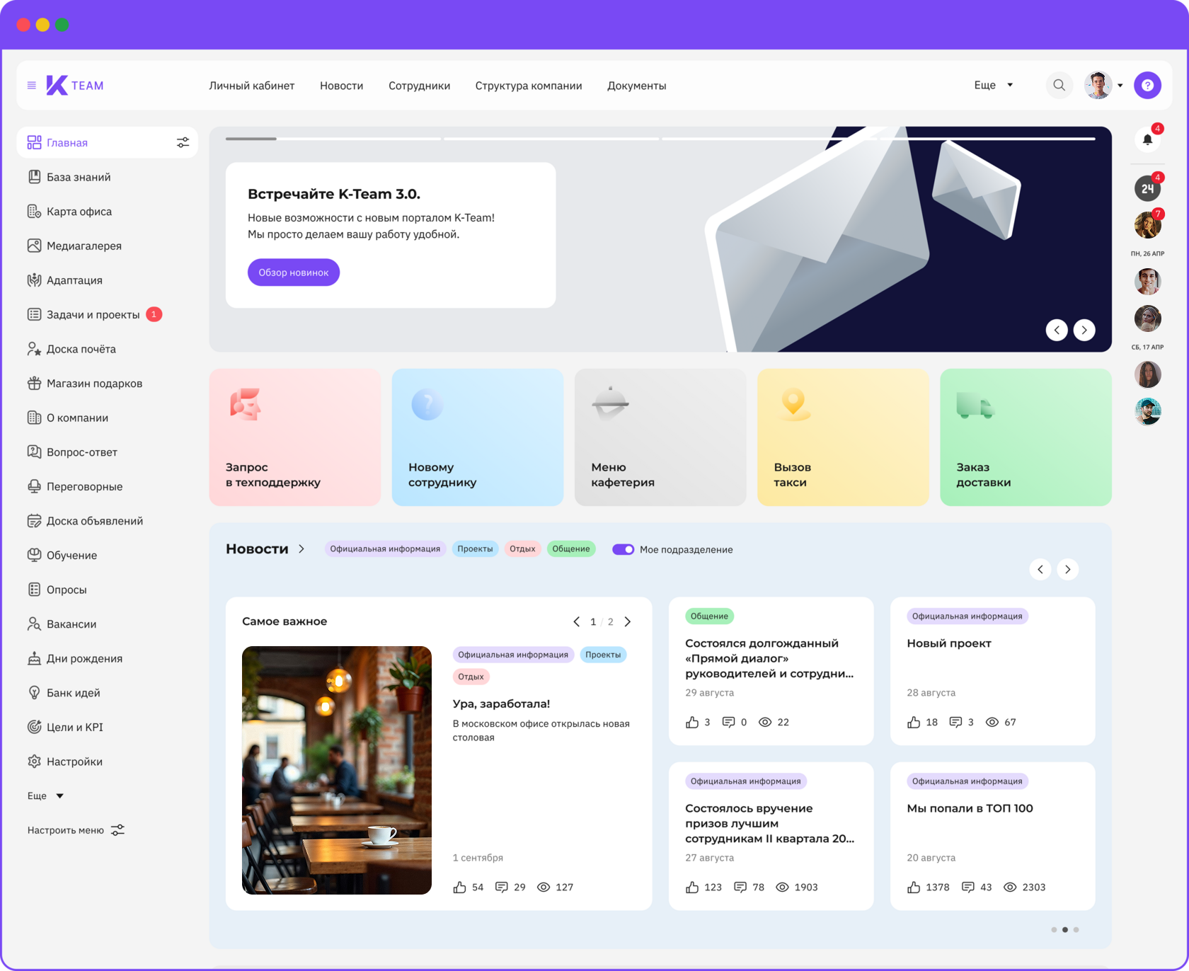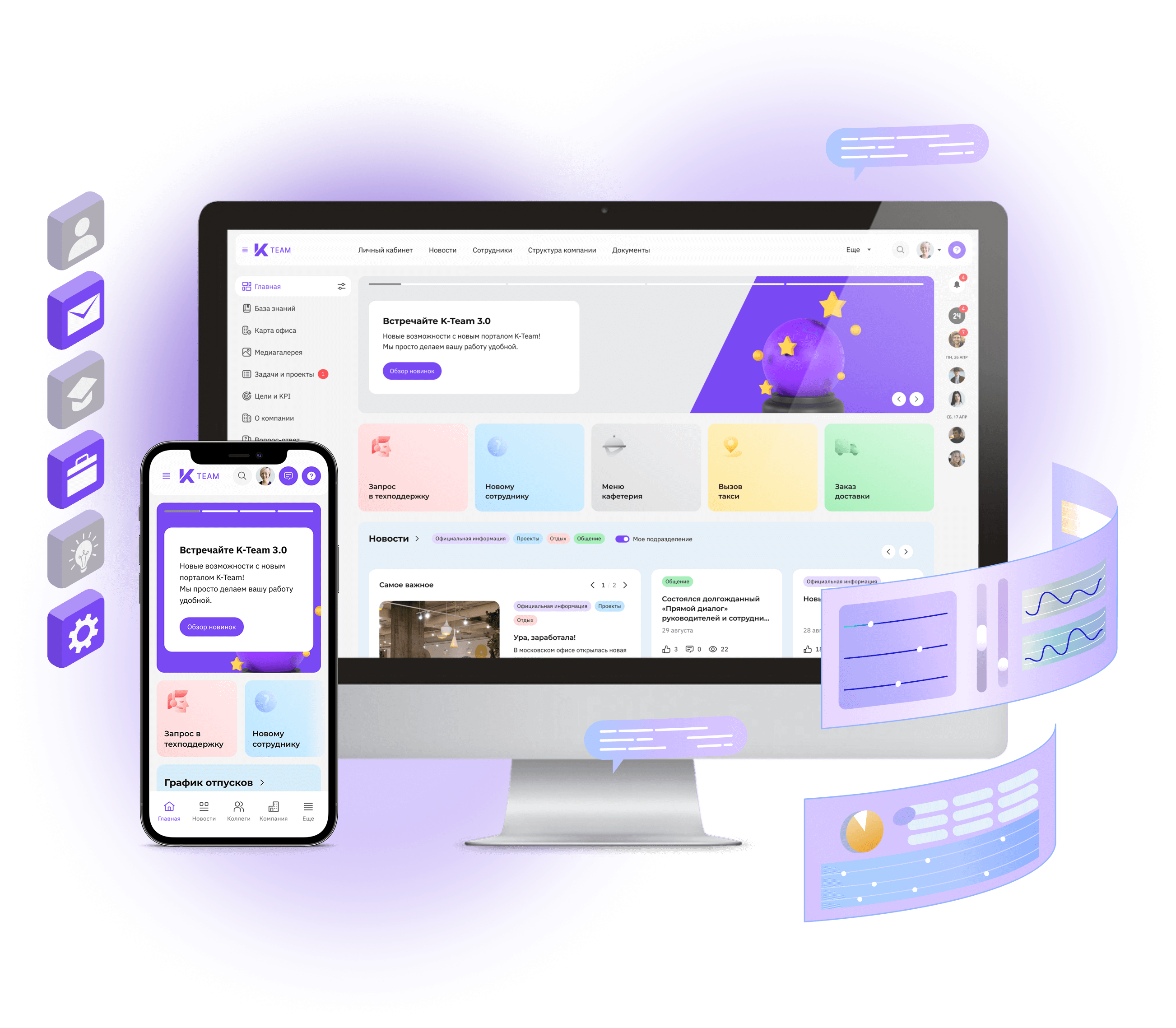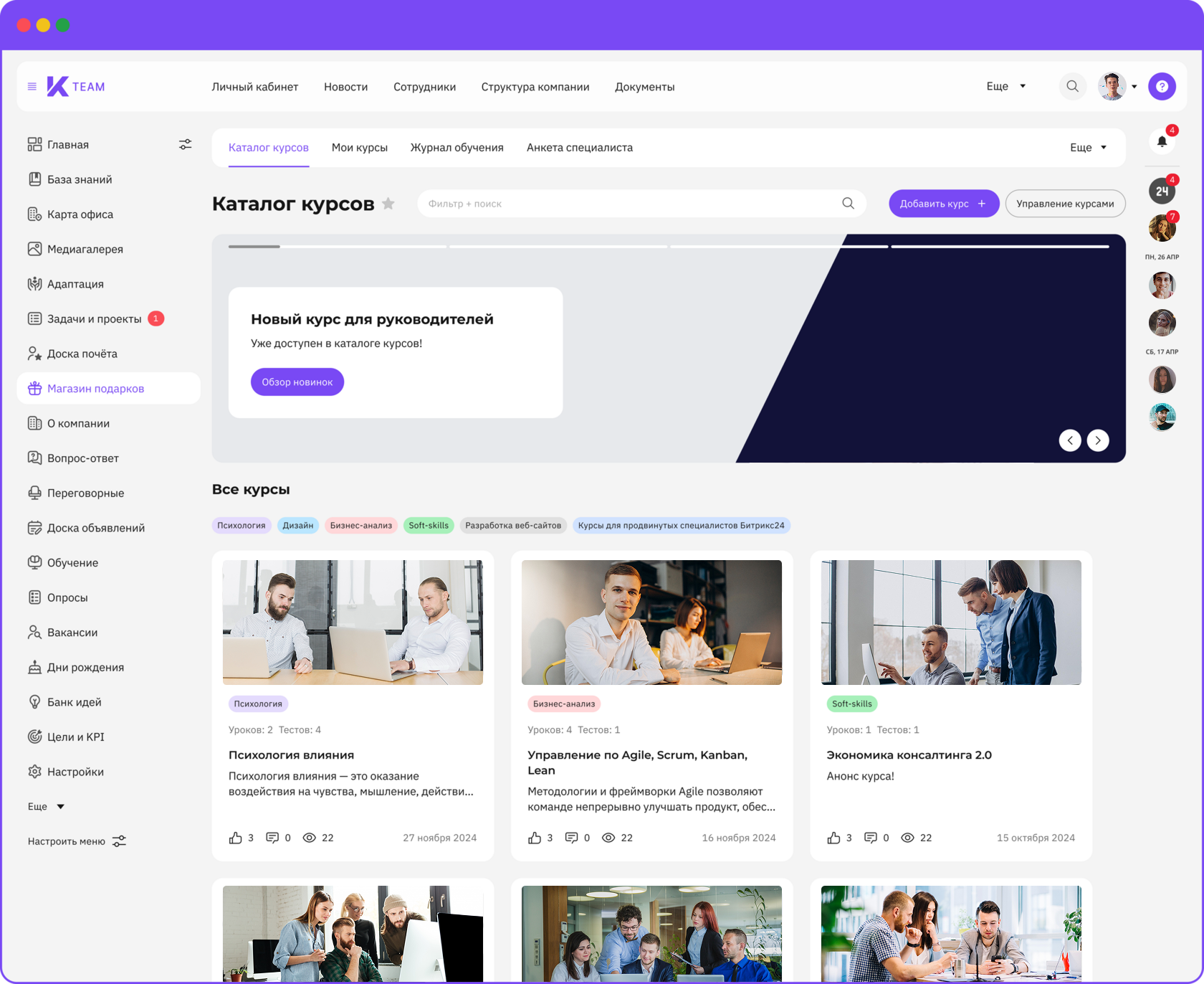 K-Team HRM — это модульное all-in-one решение, разработанное ГК «КОРУС Консалтинг». В состав платформы входят корпоративный портал, личный кабинет сотрудника, база знаний, модули адаптации, геймификации, обучения и развития, управления по целям и KPI и не только.