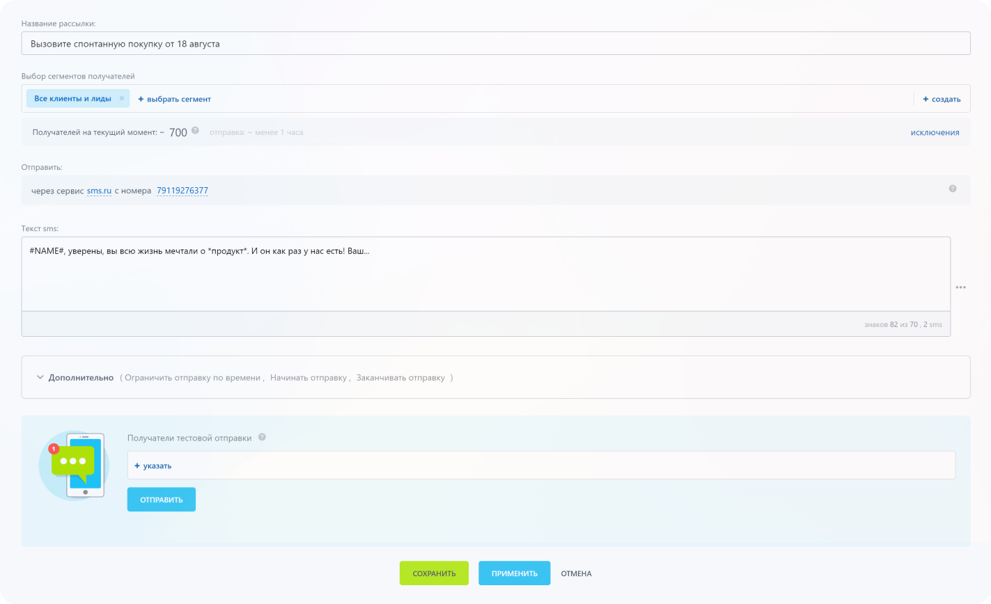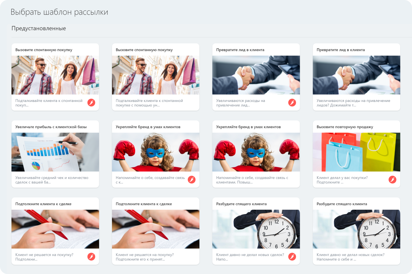 Приложение позволяет создавать универсальные шаблоны сообщений, а также настраивать автоматическую рассылку клиентам с помощью Роботов и Бизнес-процессов.