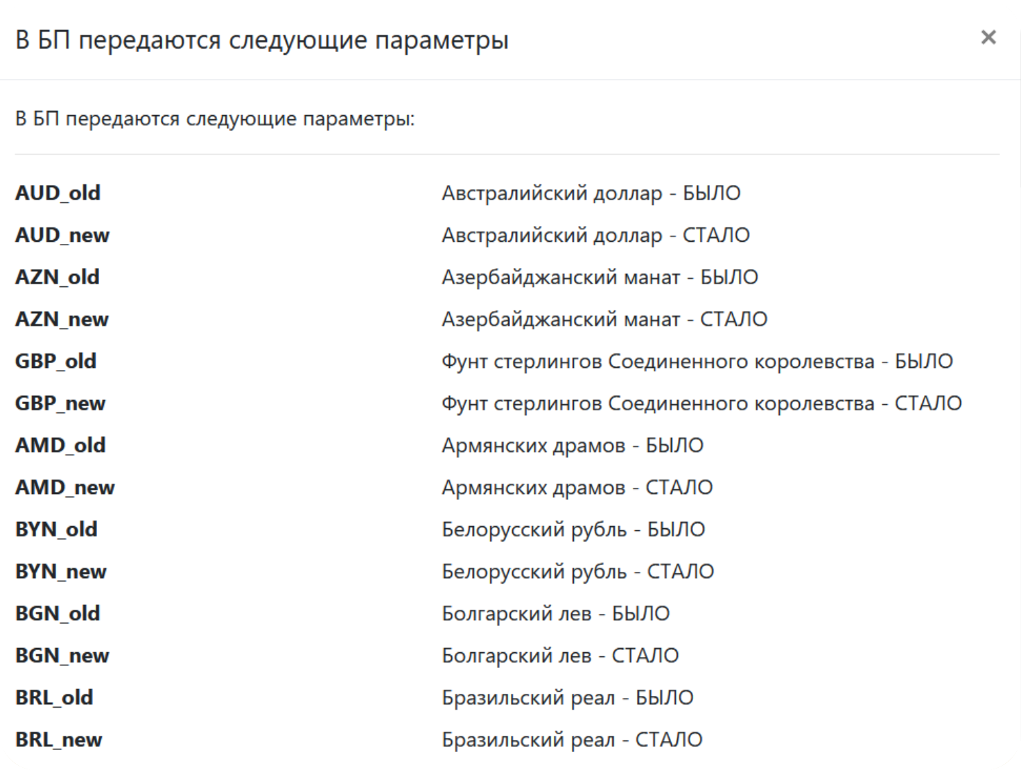 Сформированное сообщение может содержать в себе не только курс доллара и евро, но и любых других валют мира. Вы можете самостоятельно вписать необходимые параметры валют, которые необходимо передавать в Бизнес-процесс.