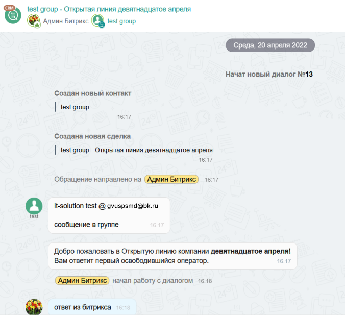 Менеджерам вашей компании не придется заходить в Telegram, чтобы ответить на вопросы клиентов. Все входящие сообщения из мессенджера автоматически попадут в открытую линию на вашем портале Битрикс24. При этом сотрудники смогут ответить на сообщения непосредственно в открытых линиях, а клиенты увидят ответы в своих чатах с ботом.