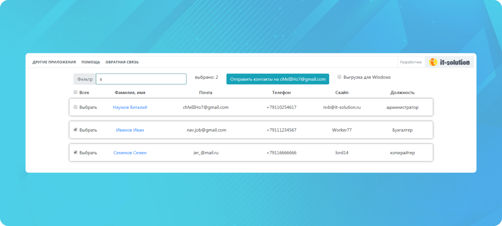 Выводит список сотрудников портала с возможностью фильтра, при нажатии на кнопку отправляет карточки с контактами выделенных пользователей на электронную почту.