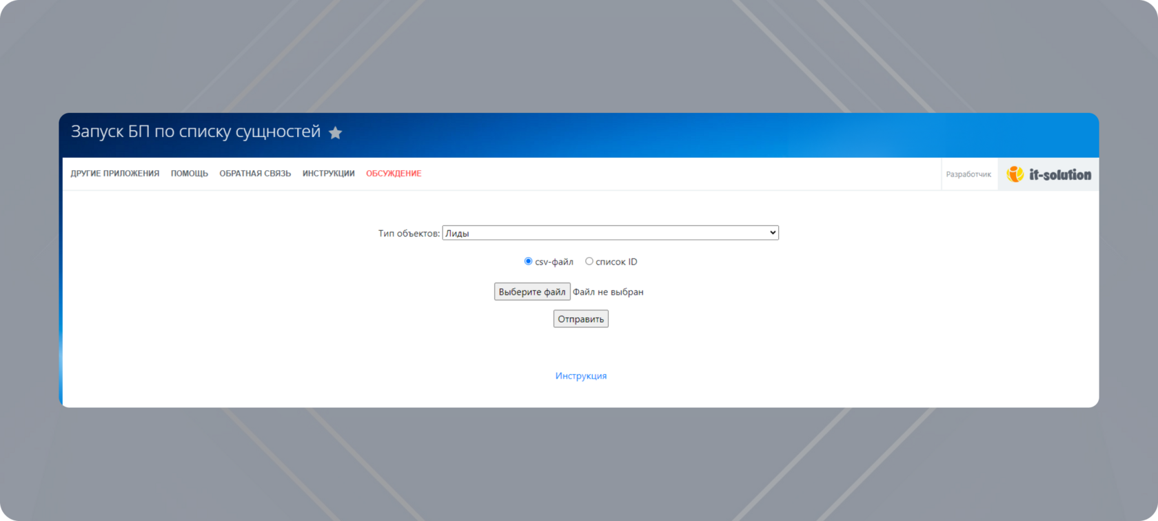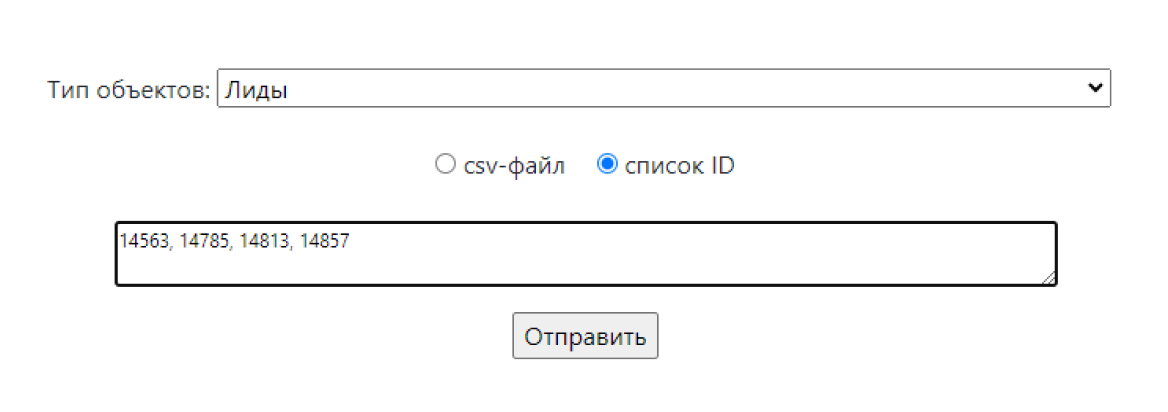 Дополнительно вы можете заполнить список сущностей CRM вручную, а не только через загрузку файла CSV. Просто укажите ID сущностей через запятую, точку с запятой или пробел.