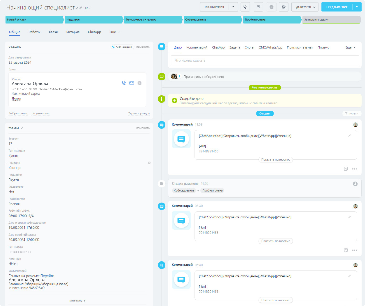 После того как вы получите данные по откликам в виде Сделок, вы сможете использовать весь широкий инструментарий Битрикс24 для удобной работы с ними. Например, выбрать ответственного, установить напоминание о собеседовании и многое другое.