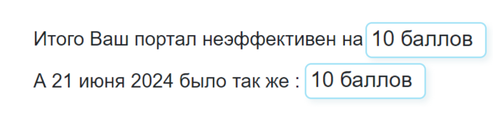 Отчет содержит в себе не только итоговую оценку портала за текущий период, но и за прошедший. Таким образом вы сможете отслеживать эффективность портала в динамике.