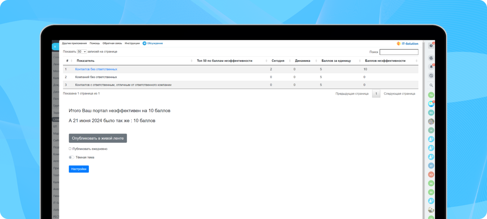 Вы можете поделиться результатами проверки в «Живой ленте» вручную или настроить автоматическую ежедневную публикацию. Это позволит быстро оповестить всех пользователей портала о его эффективности и быстро исправить недочеты.