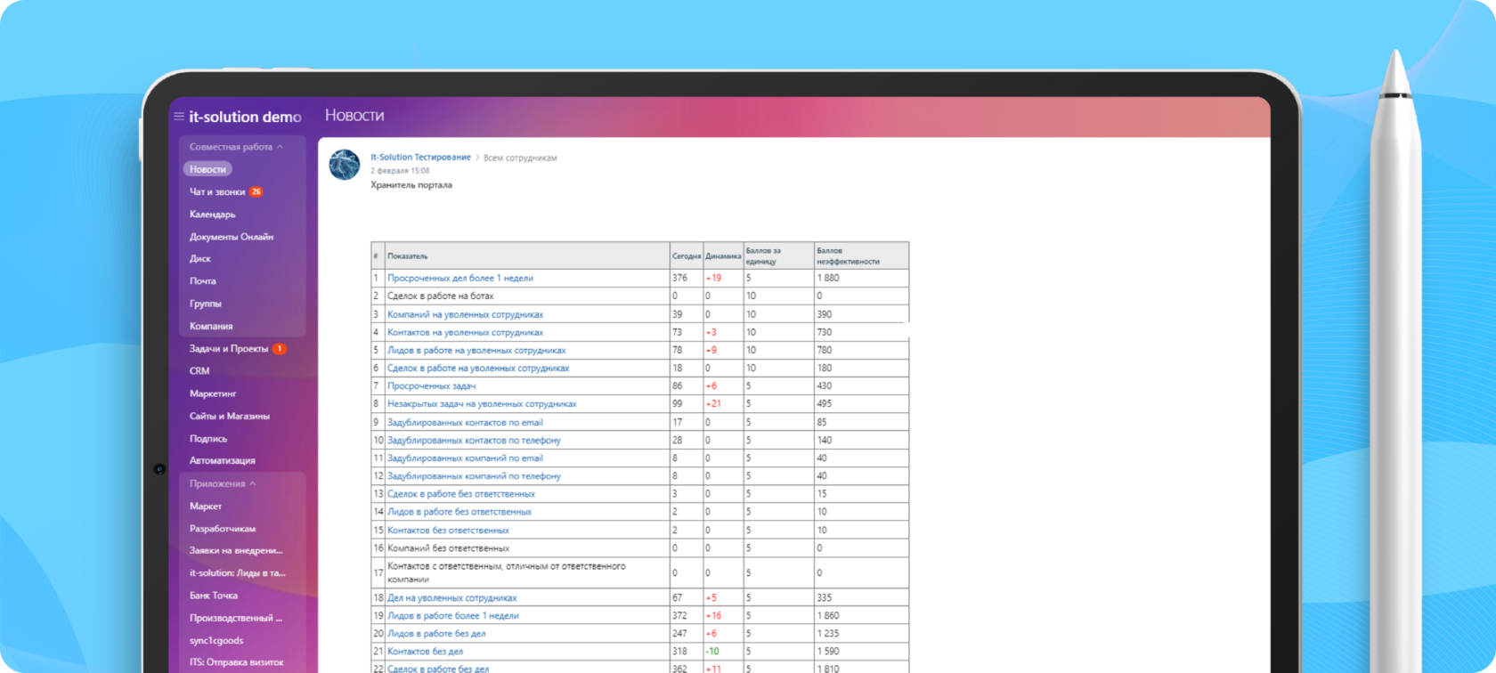 Приложение, которое позволяет удобно отслеживать эффективность портала Битрикс24. Сформированный отчет содержит информацию по количеству просроченных дел, дубликатов контактов по телефону/электронной почте, закрепленных дел за уволенным сотрудником и многому другому.