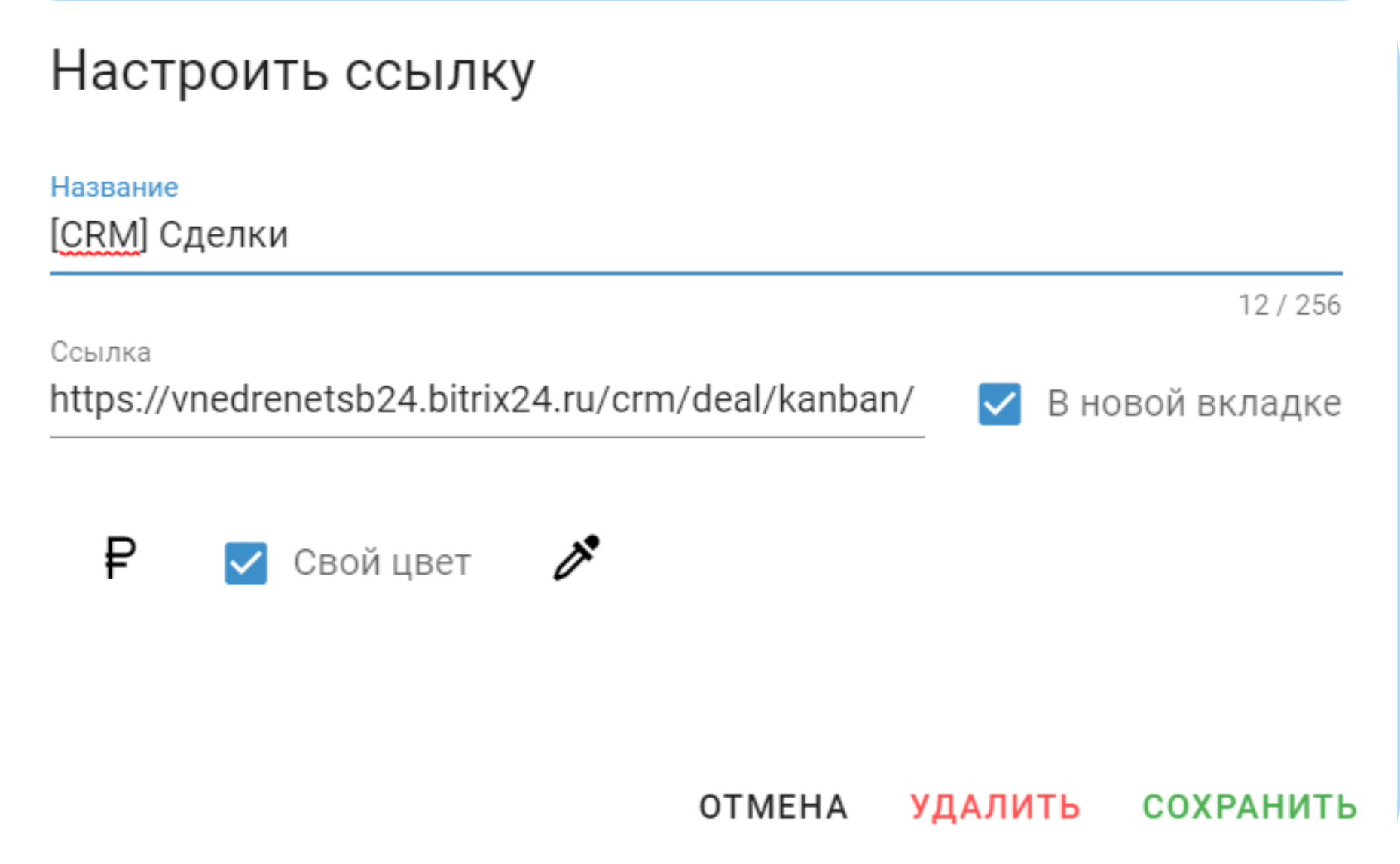 Приложение, которое позволяет хранить ссылки на необходимые разделы портала Битрикс24 в настраиваемом меню. Используя приложение, вы сможете быстро перейти в нужный раздел портала, а не тратить время на его поиски в общих списках. Также в меню можно хранить ссылки на любые другие ресурсы и сайты.