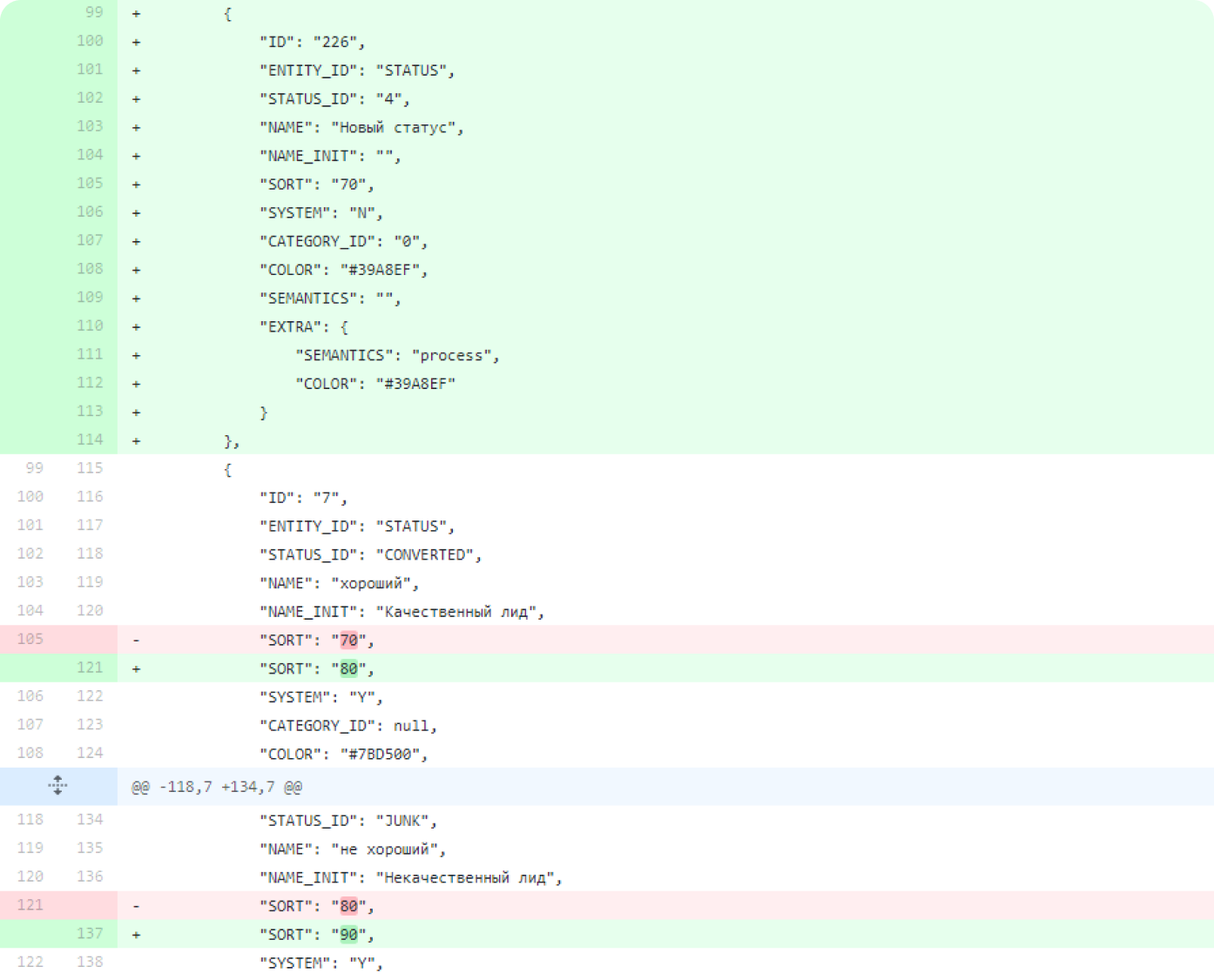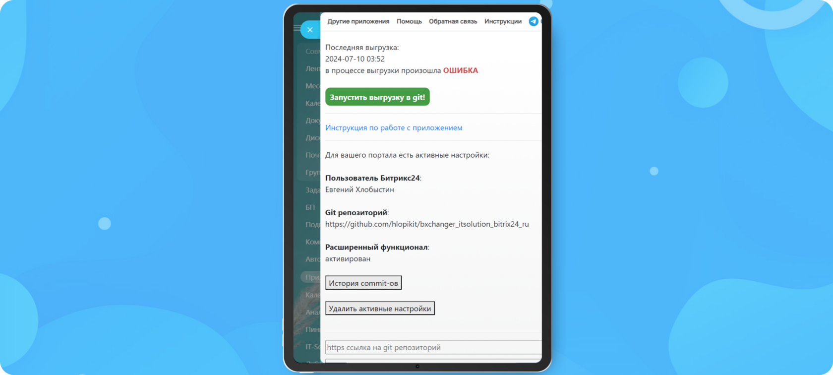 Приложение позволяет просмотреть историю изменений настроек на портале Битрикс24 в репозитории Git. Благодаря этому вы сможете отследить удаление прав доступа у пользователя, корректировку воронки продаж, добавление новой стадии сделки и многое другое.