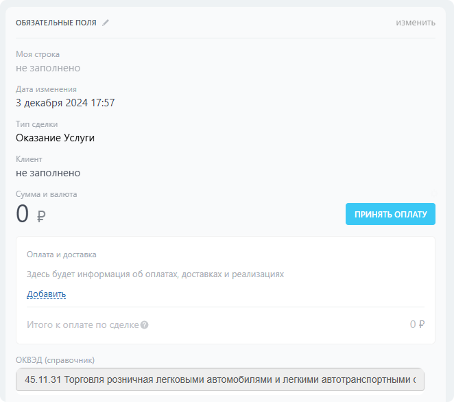 3. Проверьте в любой карточке (Лида/Контакта/Сделки/Компании) новое поле ОКВЭД "справочник" (если Вы его не видите, поищите его через кнопку "Выбрать поле").