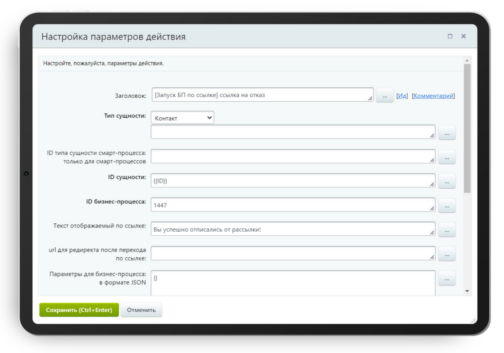 Вы можете включить в ссылку параметры, которые необходимо передать в запускаемый бизнес-процесс. Например, ID Контакта, который отписался от рассылки или подтвердил заказ.