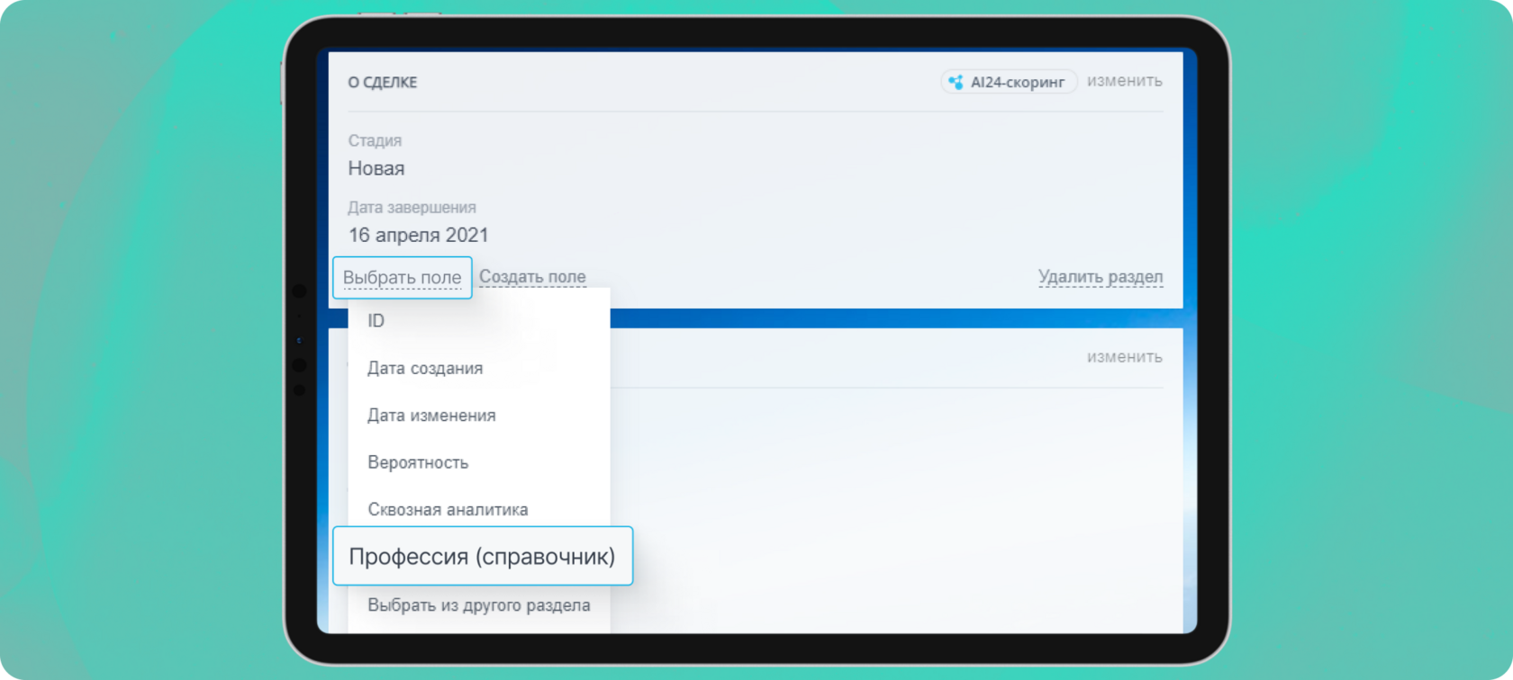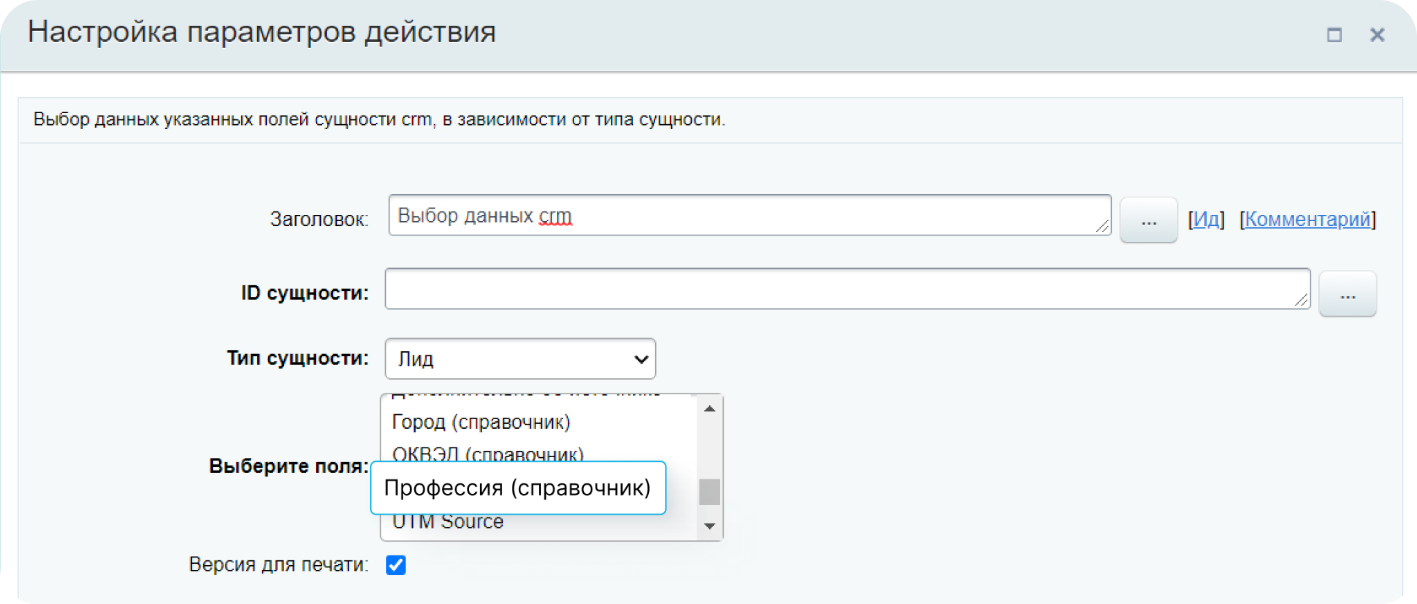 3. Проверьте в любой карточке (Лида/Контакта/Сделки/Компании) новое поле Профессии "справочник" (если Вы его не видите, поищите его через кнопку "Выбрать поле").