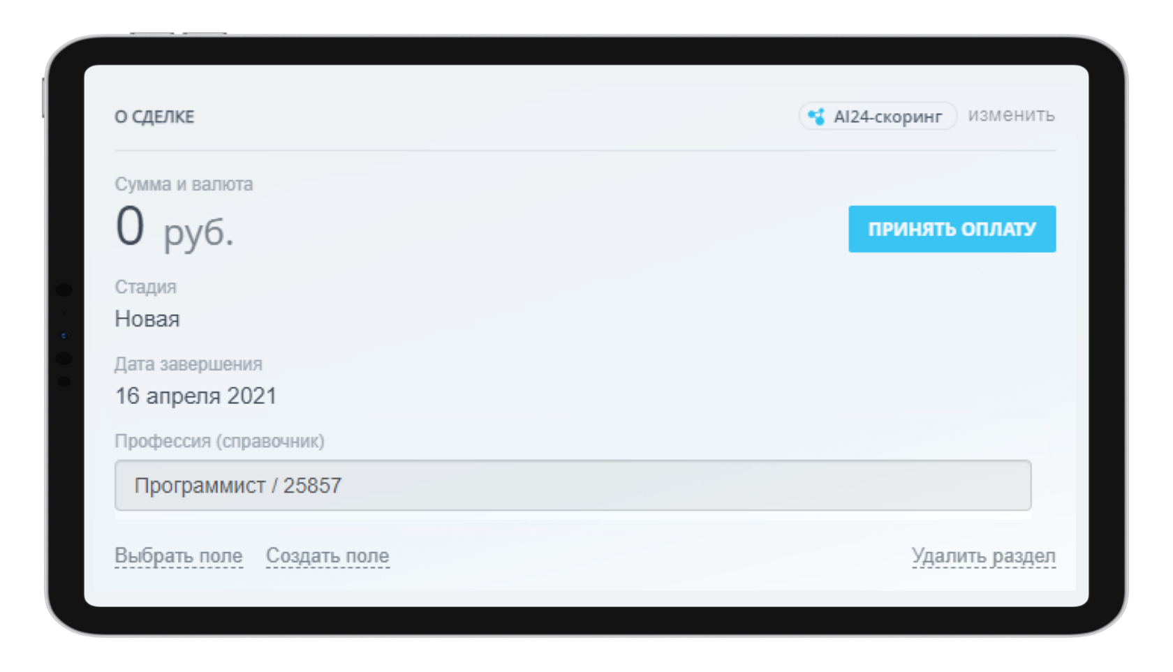 При конвертации сущности, например из Лида в Сделку, данные о профессии контактного лица не удалится, а также зафиксируются в новой сущности. Вам не придется повторно указывать добавленную ранее информацию.